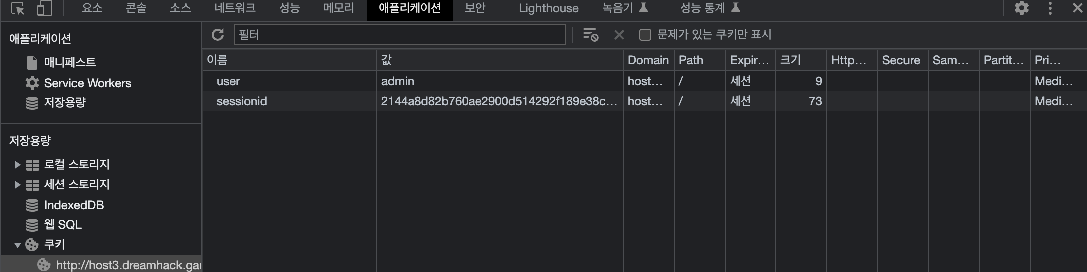 그 다음, 개발자 도구로 sessionid값에 복사한 값을 입력시켜주고 이름에 user 값에 admin을 입력시켜 주고 새로고침 해줍니다.