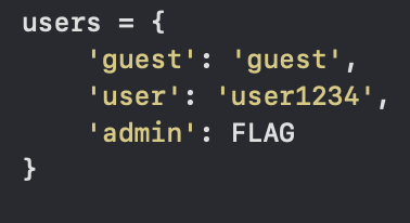 크게 guest, user, admin 과 같이 3개의 계정의 정보가 있는 것을 확인할 수 있습니다. 여기서 중요한 요점은 admin계정만 비밀번호가 주어지지 않았는데 바로 FLAG값을 찾는 것이 이 문제의 핵심이라고 할 수 있습니다.