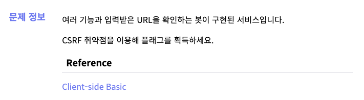 여러 기능과 입력받은 URL을 확인하는 봇이 구현된 서비스입니다. CSRF 취약점을 이용해 플래그를 획득하세요. Reference Client-side Basic