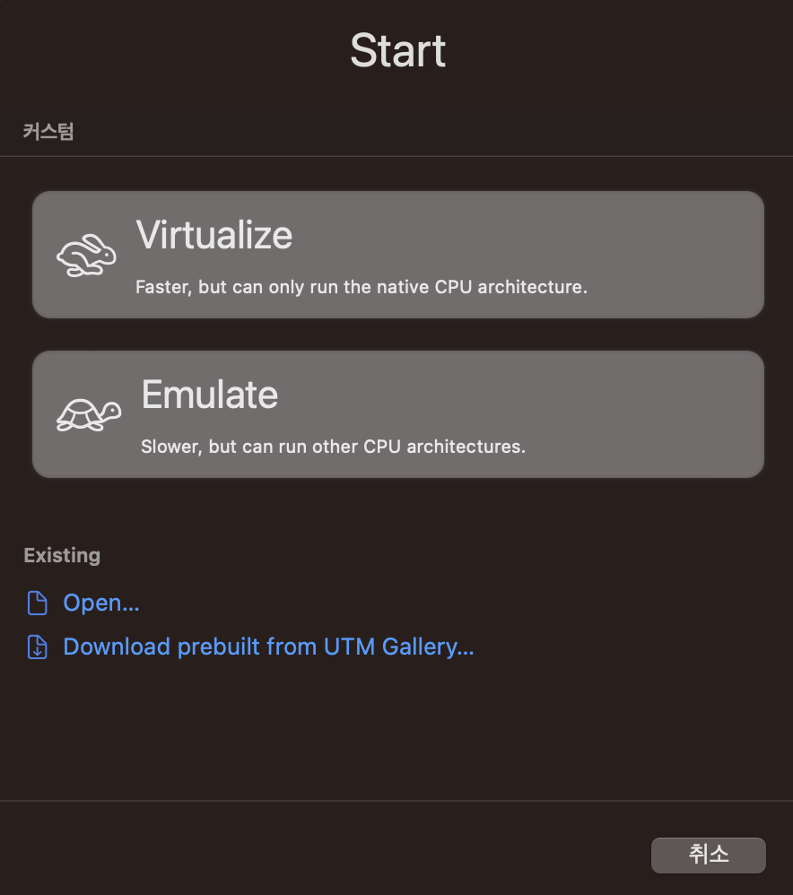 '새 가상머신 만들기' 클릭하게 되면 위와 같은 화면이 나오게 되는데 'Virtualize'를 클릭합니다.