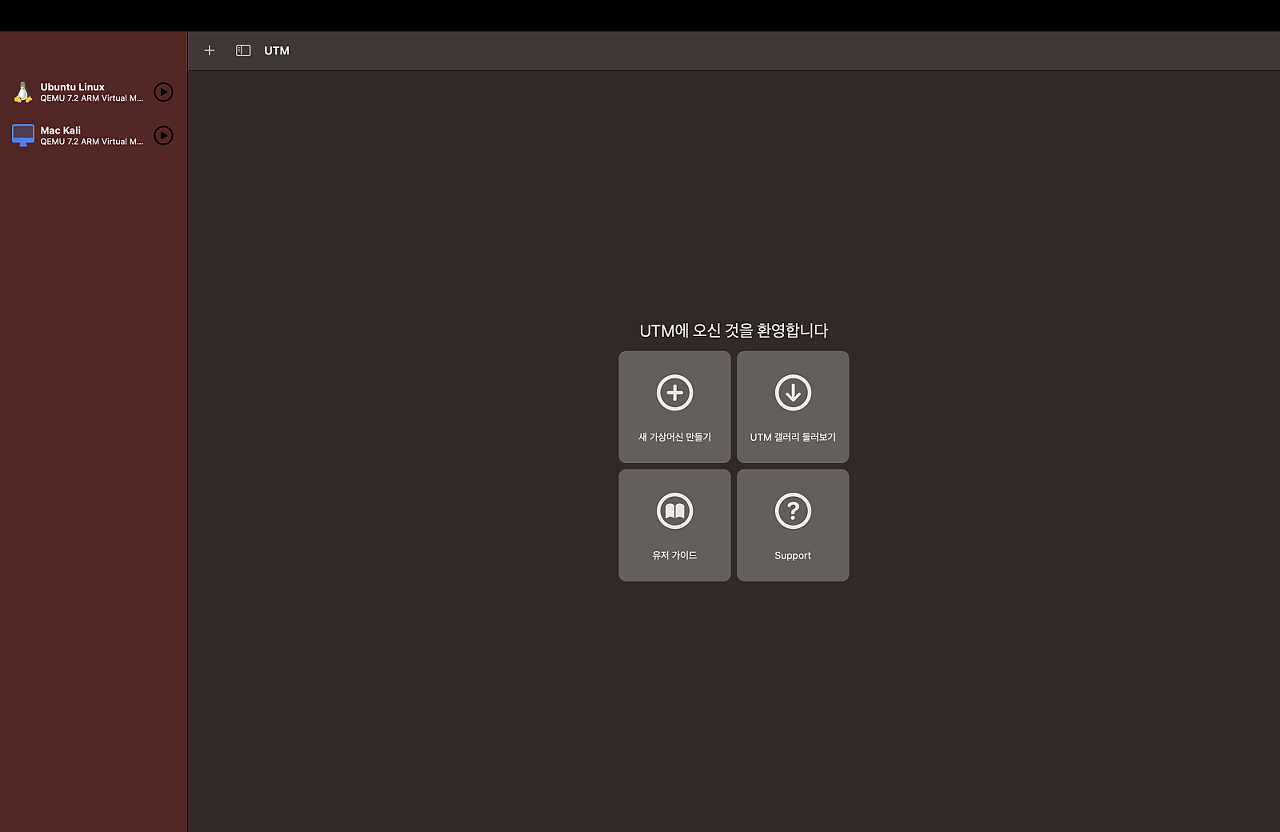 이제 마지막으로 가상머신 이름을 선택해주고 '저장'을 누르면 UTM메인 화면이 나오게 됩니다.
